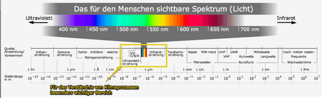 Für das Verständnis der Vorgänge in der Atmosphäre sind neben dem sichtbaren Licht auch die Ultraviolette (= UV) Strahlung und die Infrarotstrahlung wichtig. Während die Wellenlängen der UV Strahlung kleiner sind als die des sichtbaren Lichts (sie ist kurzwelliger), hat Infrarotstrahlung größere Wellenlängen (sie ist langwelliger). UV-Strahlung, sichtbares Licht und Infrarotstrahlung werden unter dem Begriff »Wärmestrahlung« zusammengefasst.