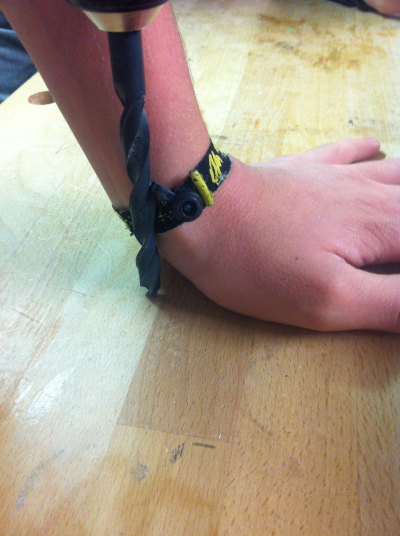 - Beim Durchgang des Bohrers durch das Material den Bohrer weiterlaufen lassen, während man ihn wieder durch das Loch herauszieht