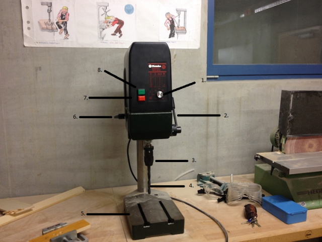 ![]() | 1. Drehzahleinsteller 2.feiner Bohrhebel 3.Bohrfutter 4.Bohrer 5. Bohrunterlage 6. grober Bohrhebel 7. Ausknopf 8. Anknopf |