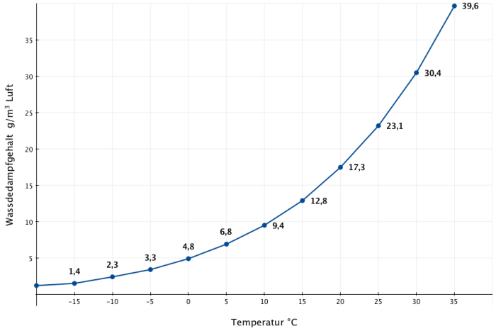 Abb. 1: Beziehung zwischen der Temperatur der Luft und ihrer Fähigkeit, Wasserdampf aufzunehmen (Sättigungsmenge).1)